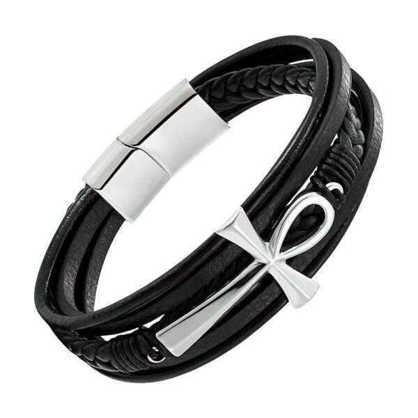 Un bracelet cuir ancre croix en acier argenté composé de trois lanières en peau véritable et d’un fermoir magnétique en métal brillant.