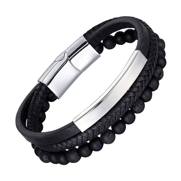 Il est composé d’un tour en cuir tressé plat, d’un rang de perles en pierres volcaniques naturelles et d’une rangée intégrant en son centre une plaque en acier inoxydable monté sur une bande de cuir plate. Son solide fermoir à glissière magnétique s’avère très pratique pour mettre ou pour retirer facilement le bracelet de votre poignet. Vous cherchez une idée cadeau qui fera plaisir à tous les coups, alors ce bracelet masculin à la finition sans faille est celui qu’il vous faut.